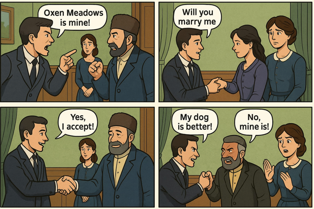 🔵 Answer: They quarrel over the ownership of Oxen Meadows.