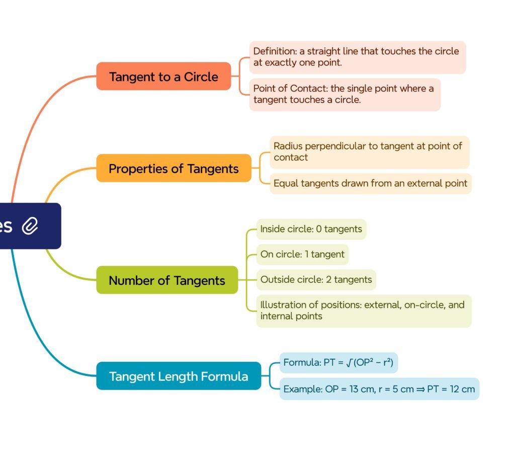 A tangent is always ⟂ to the radius at the point of contact, and tangents from an external point are equal. The tangent length from an external point P to a circle with centre O and radius r is:
