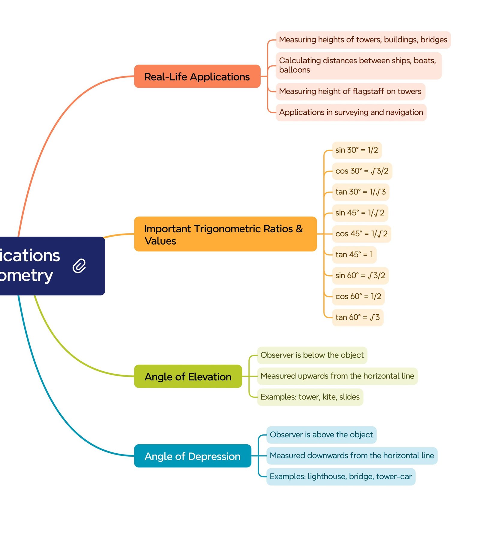 Example idea: From the top of a lighthouse 50 m high, the angle of depression of a ship is 30°. Find the horizontal distance of the ship from the lighthouse base.