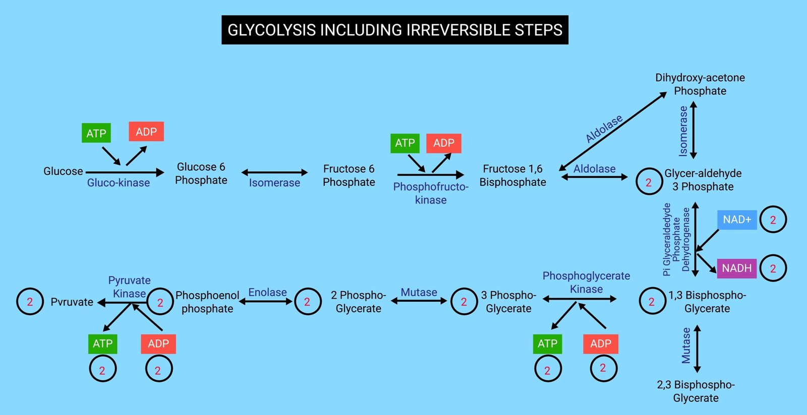 1️⃣ Glucose (6C) phosphorylated → Glucose-6-phosphate