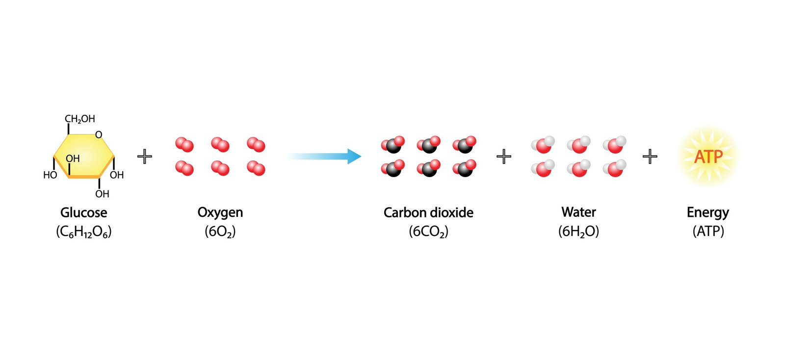C₆H₁₂O₆ + 6 O₂ → 6 CO₂ + 6 H₂O + Energy (≈ 686 kcal)