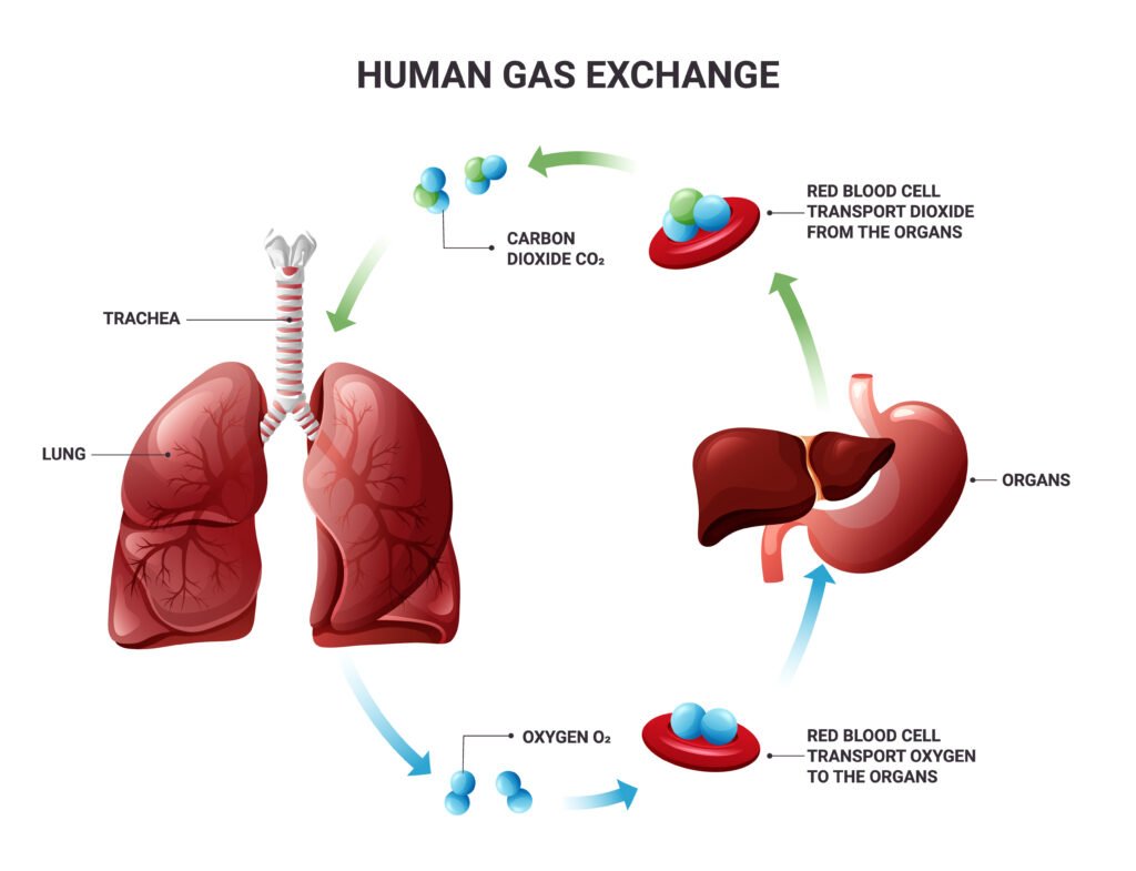 Human gas exchange. Oxygen transport cycle from lungs to organs. Vector illustration isolated on white background