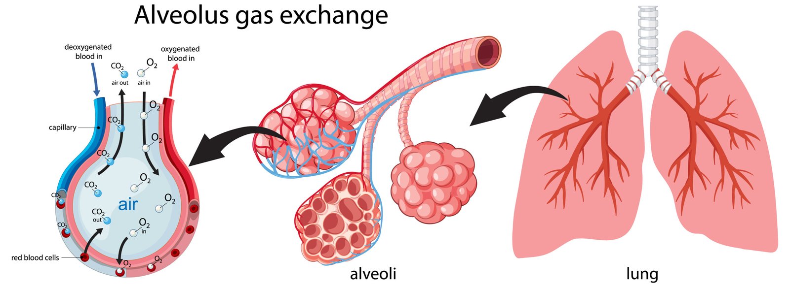 Vector diagram showing alveolus gas exchange, alveoli structure, and lung anatomy with labeled pathways