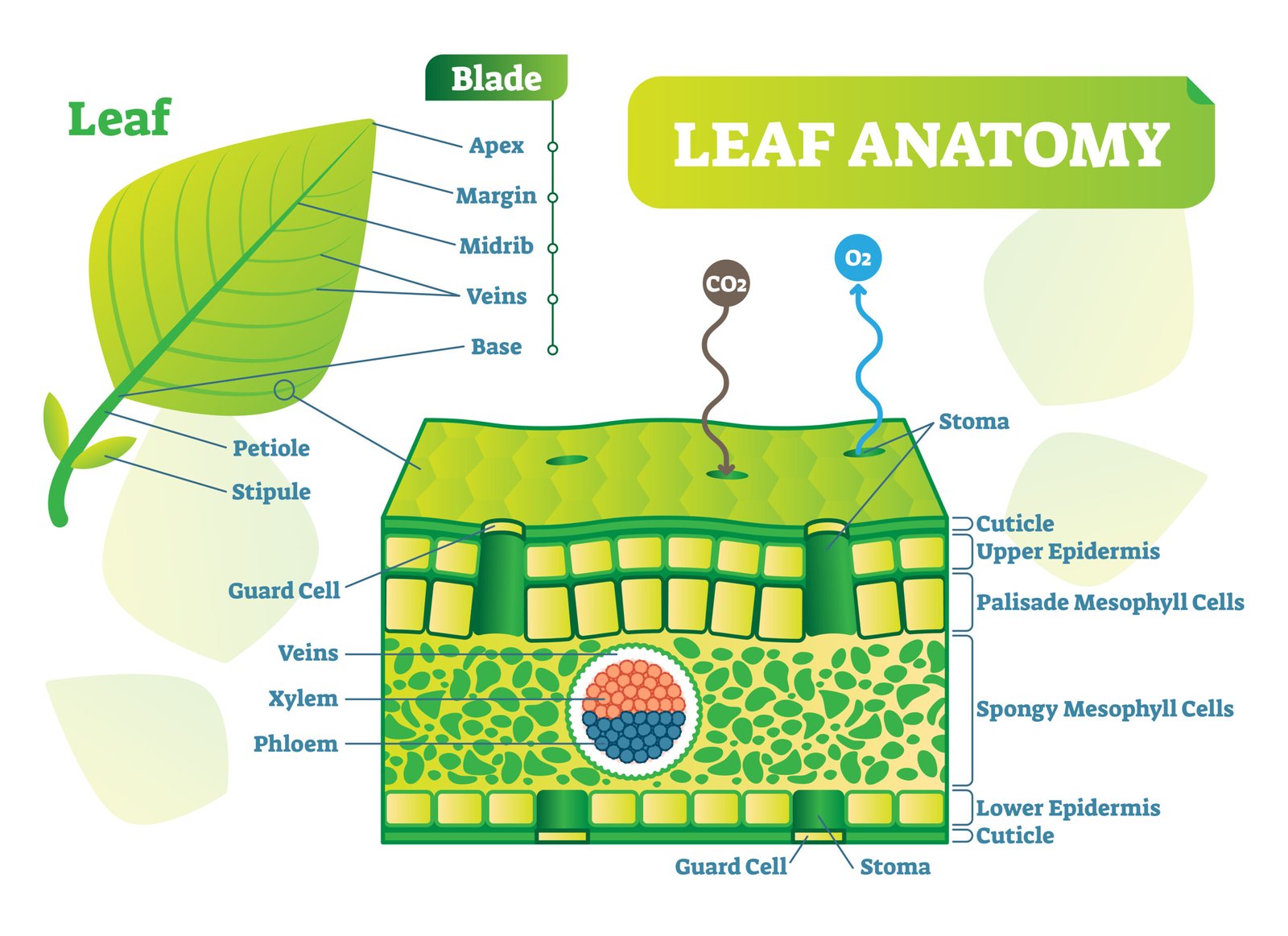 The leaf is a green, flattened lateral organ borne on the stem at nodes; primary site of photosynthesis, transpiration, and gas exchange 🍀.