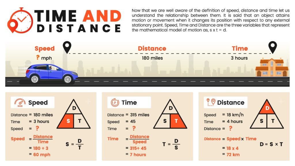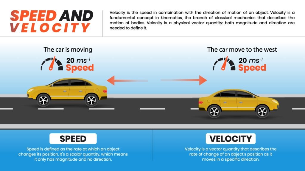 Displacement: Change in position in a straight line with direction (vector quantity).