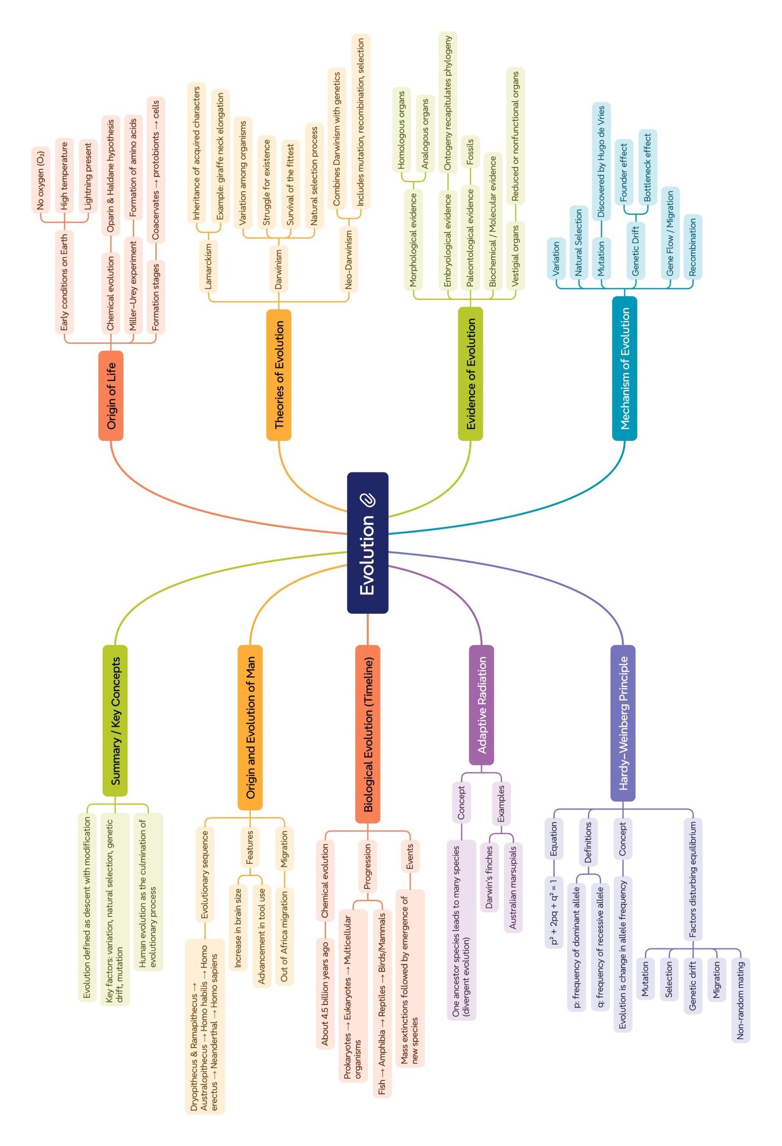 Evidences of evolution come from comparative anatomy (homologous and analogous organs), fossils, embryology, and molecular studies. Hardy–Weinberg equilibrium mathematically explains genetic stability in populations, with deviations indicating evolutionary change. Factors like mutation, selection, genetic drift, and gene flow drive this change.