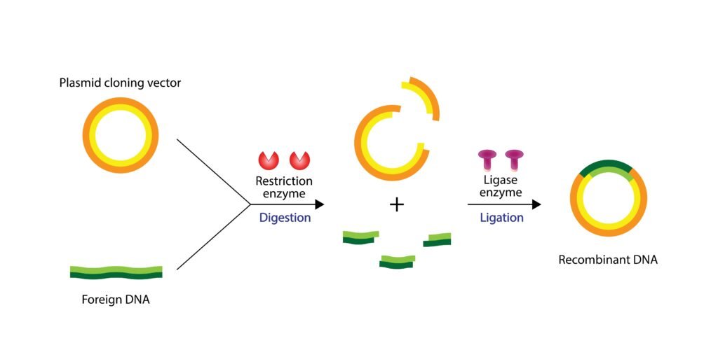 ✂️ Tools: Restriction enzymes, ligase, vectors, host cells.