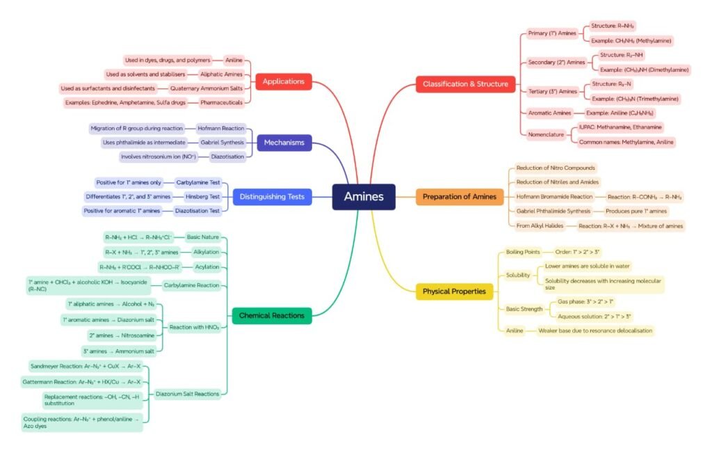 🟠 Solubility: Lower amines soluble in water due to H-bonding; solubility decreases with size.