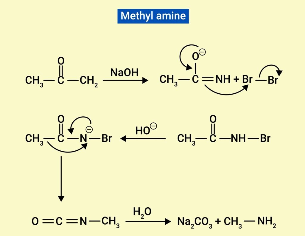 RCONH₂ + Br₂ + NaOH → R–NH₂ (1° amine, one carbon less).