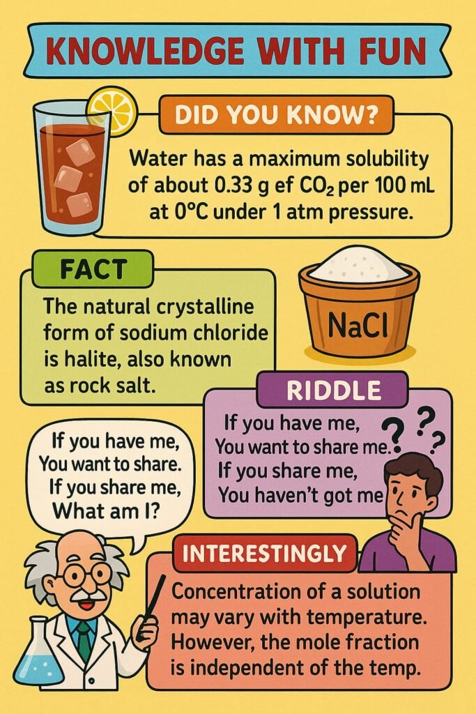 This chapter primarily deals with different types of solutions, the methods to express their concentration, the concept of solubility, the colligative properties of solutions, and Raoult’s law. Here’s a complete explanation of all concepts covered in this lesson in clear and systematic order: