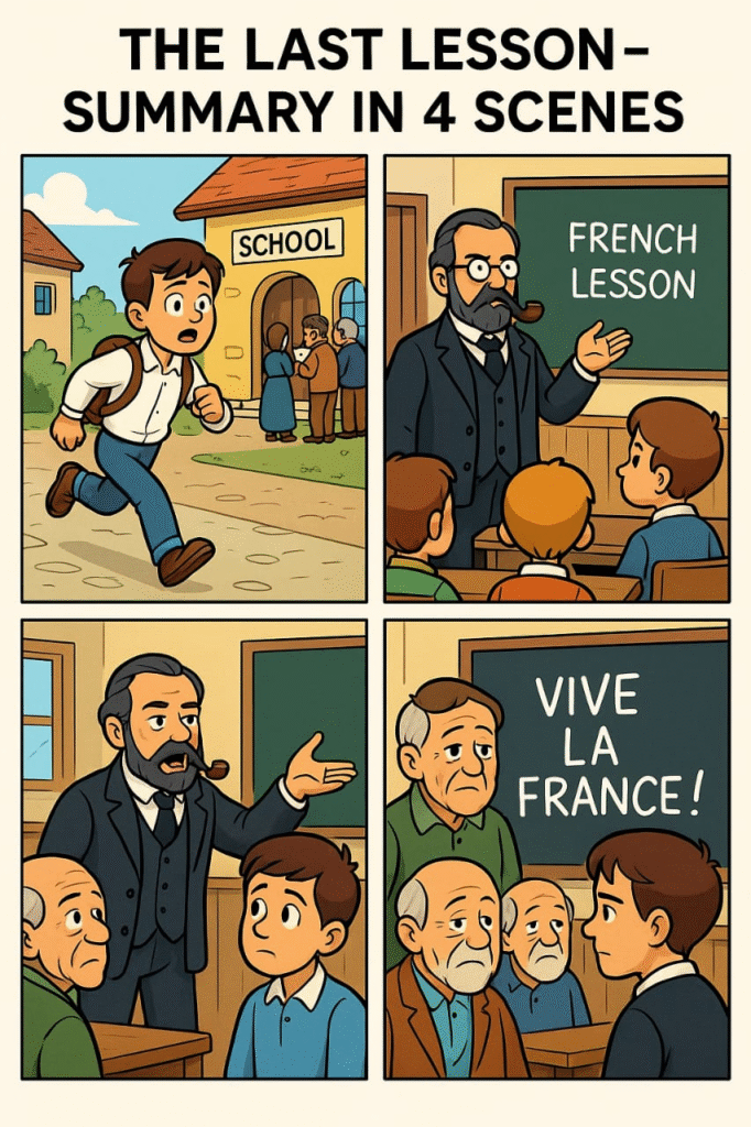 Mr. Hamel, dressed in his ceremonial green coat and frilled shirt—attire he reserved for special occasions—announces that this is his last French lesson. The news shocks Franz. He suddenly realizes how precious his language is and regrets not having taken his studies seriously. He reflects on how everyone, including his parents and Mr. Hamel, is responsible for this loss—parents for prioritizing work over education, and the teacher himself for giving students holidays and tasks unrelated to studies.