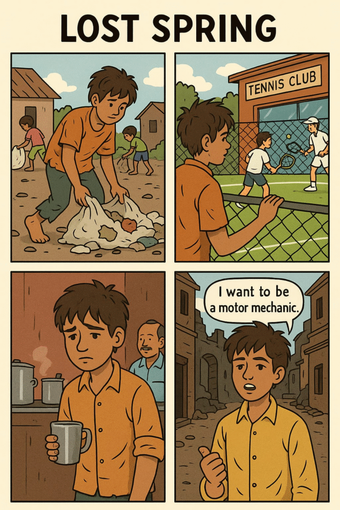 “Lost Spring” symbolizes childhood lost to poverty and labor. Spring represents innocence, joy, and new beginnings. Saheb and Mukesh, though young, are burdened by survival. Their ‘spring’ is consumed by economic hardship, making the title a poignant metaphor for stolen childhoods.
