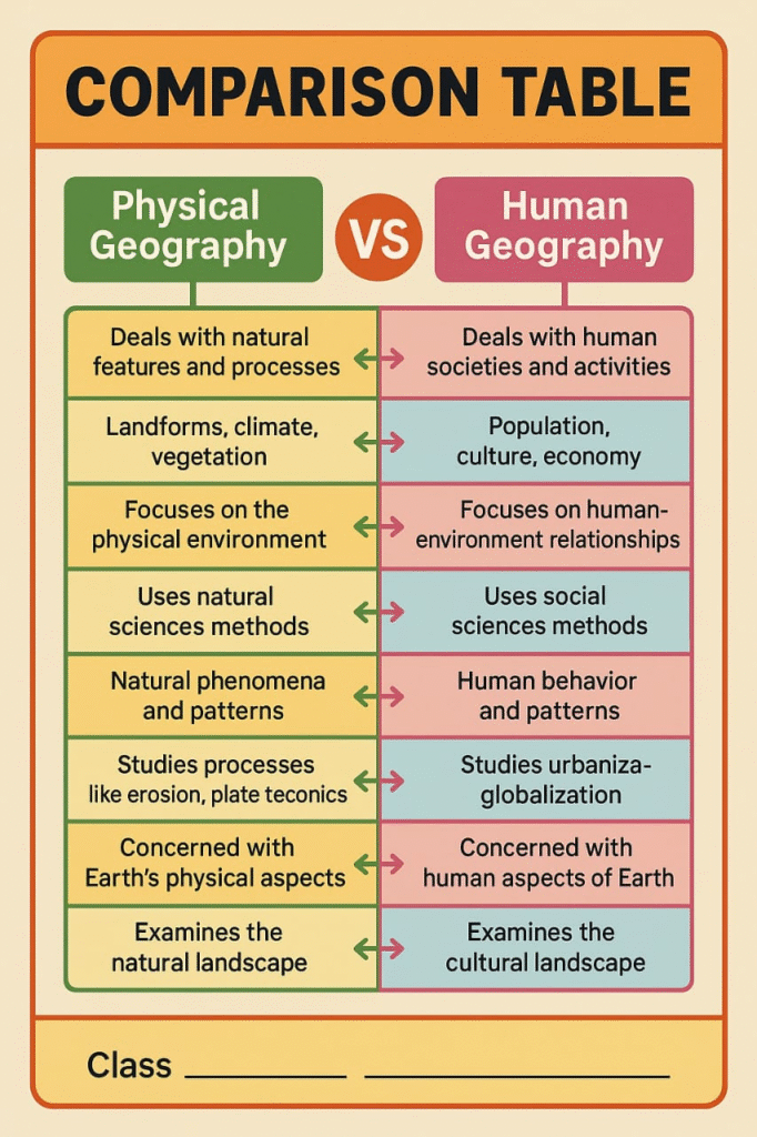 ✏️ Note: Physical geography studies the natural environment, whereas human geography studies human behaviour, patterns, and activities on the earth’s surface.