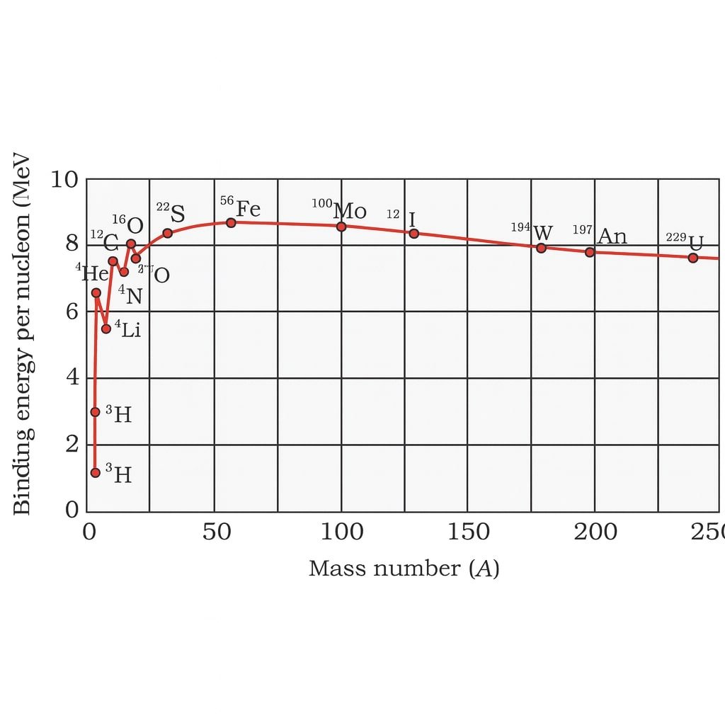Binding energy per nucleon peaks at iron (A ≈ 56).