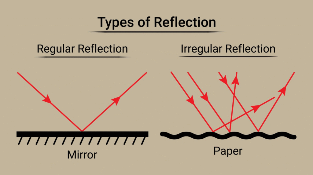 🌿 परावर्तन वह प्रक्रिया है जिसमें प्रकाश किरण एक सतह से टकराकर वापस उसी माध्यम में लौटती है।
