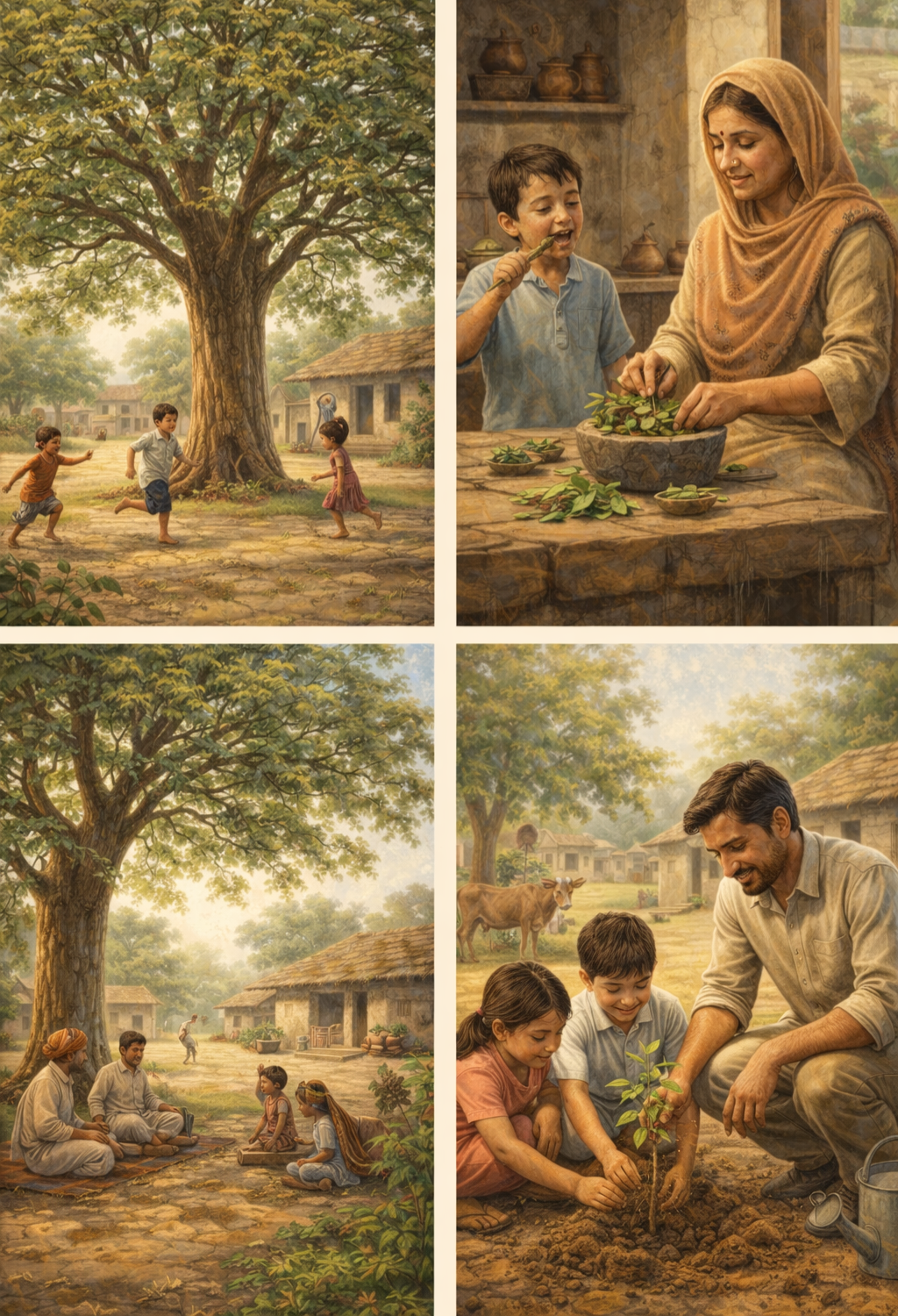 🌱 The neem tree is lovingly called Neem Baba giving it a human identity It is not treated as an object but as a wise elder The villagers believe it protects guides and blesses them This personification helps children form an emotional bond with nature The tree becomes a silent teacher spreading values through its presence