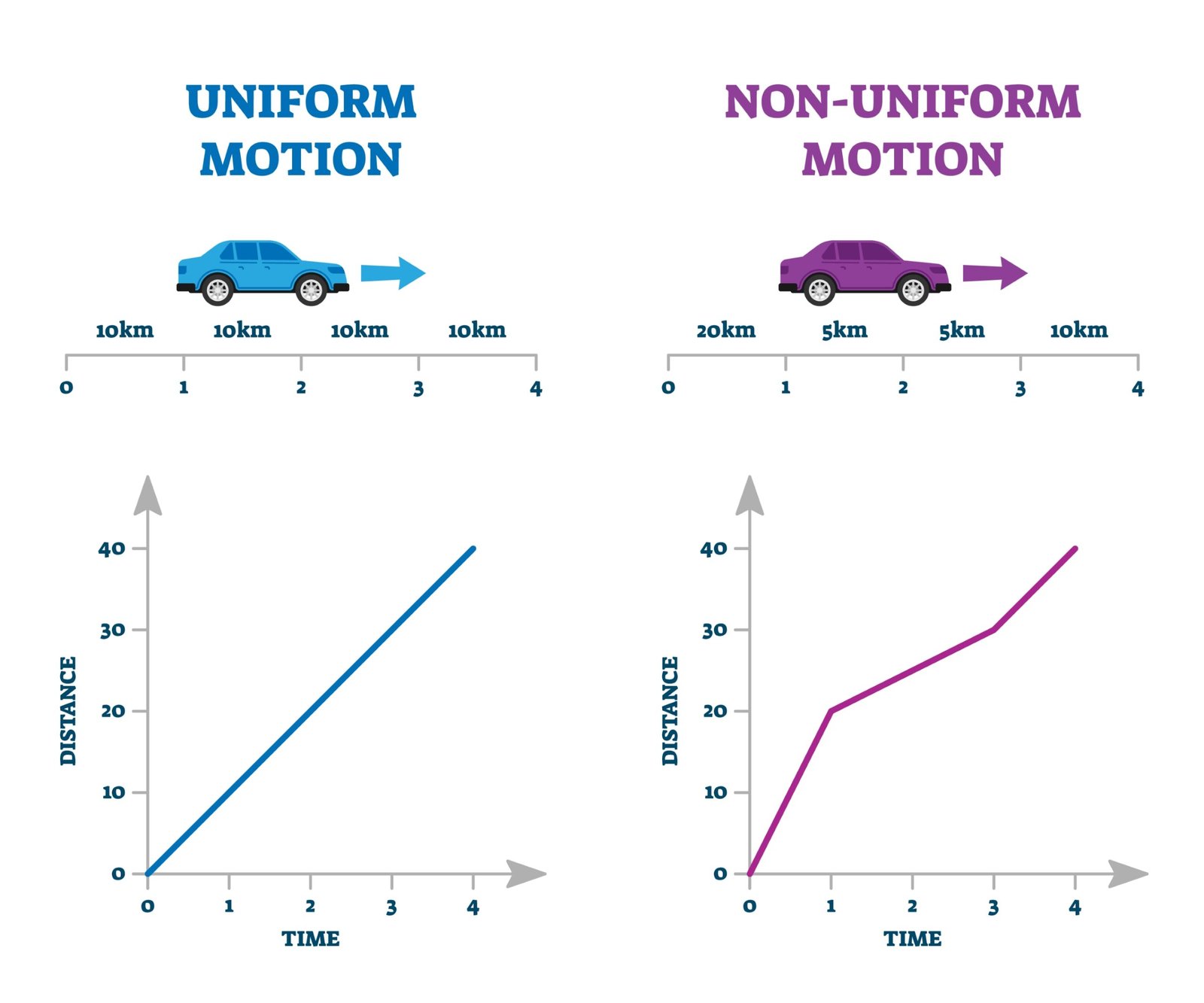 इसके विपरीत, जब वस्तु अलग-अलग समय में अलग-अलग दूरी तय करती है, तो उसे असमान गति कहते हैं ⚖️। शहर में चलने वाला वाहन असमान गति का उदाहरण है 🚗📉।