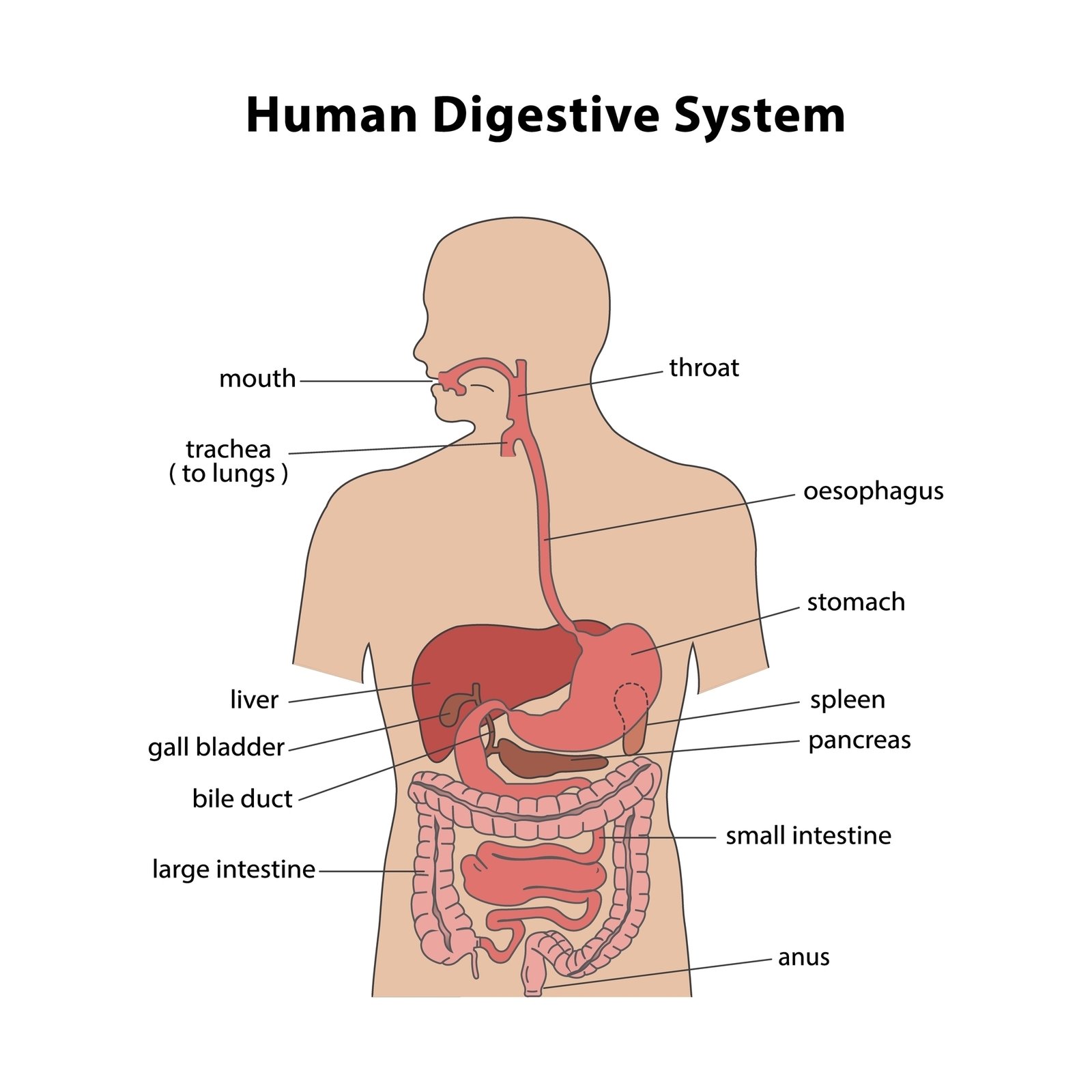 ➡️ भोजन → मुख → ग्रासनली → आमाशय → छोटी आँत → बड़ी आँत → गुदा