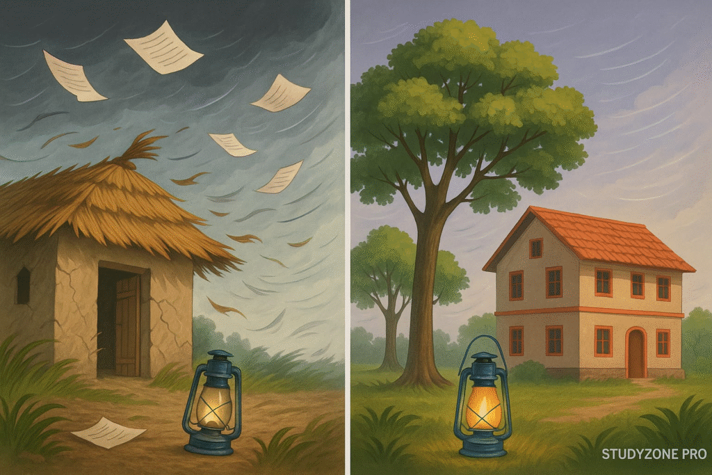 He speaks of crumbling doors, rafters, wood, and bodies, and how weak hearts and homes fall victim to the wind’s rage. Through these lines, Bharati makes a broader philosophical point: just as we must build strong houses to withstand storms, we must build strong minds and characters to face life’s troubles. The wind becomes a symbol of adversity, and the only way to fight it is by becoming resilient and prepared.