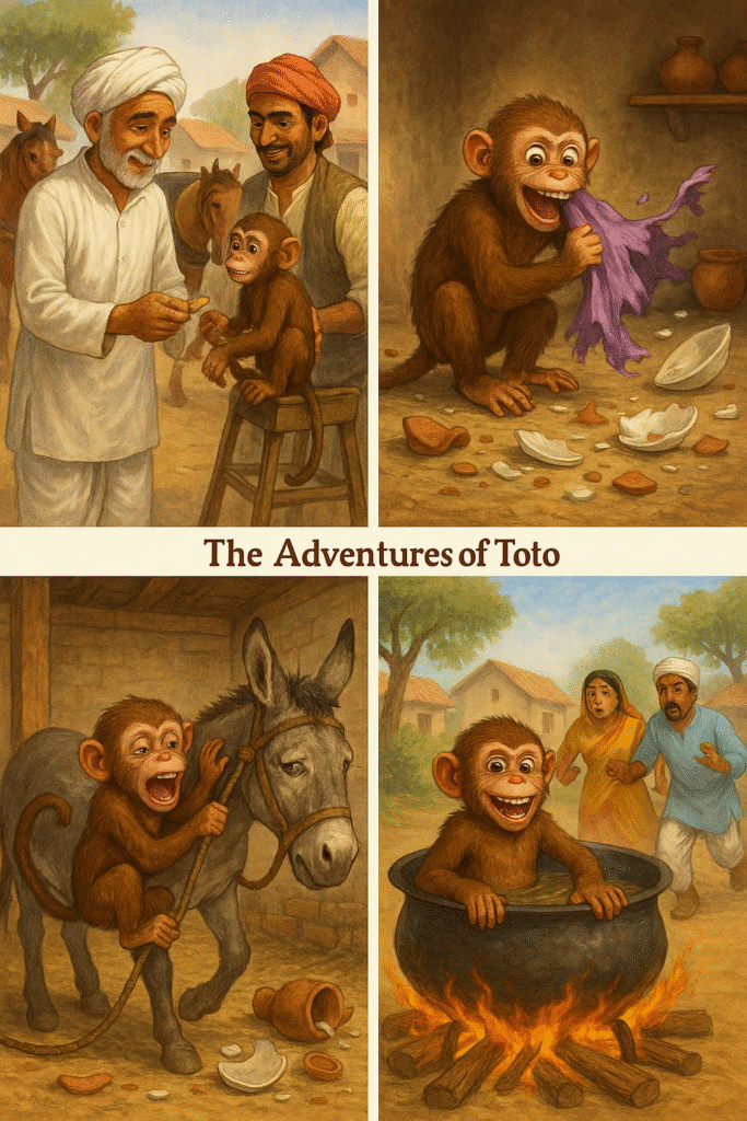 Grandfather bought Toto from a tonga-driver for five rupees because he loved collecting unusual pets. Toto was a pretty monkey with sparkling eyes, white teeth, and a tail that acted like a third hand. His mischievous expression and appearance made him seem both clever and amusing, though he soon proved to be more trouble than expected.