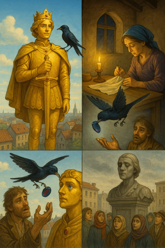 A magnificent golden statue with sapphire eyes and a ruby on his sword hilt stands above the city. Once a prince who lived in luxury, he never knew sorrow. After death, his statue is placed high above, and from there he sees the suffering of the poor.