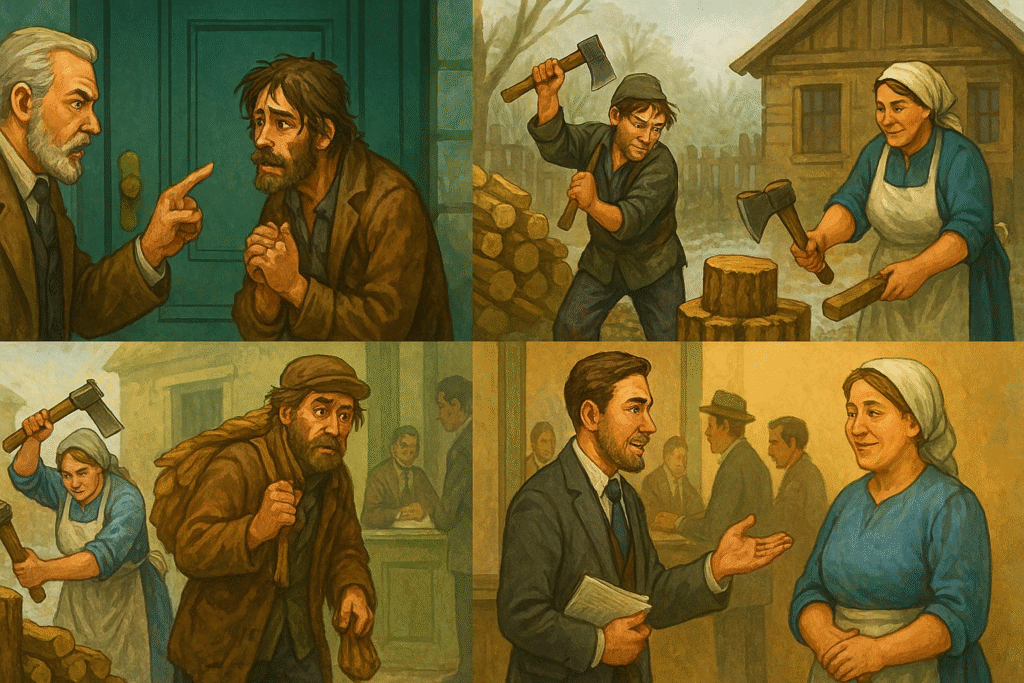✨ Imagery – Ragged beggar, chopping wood, harsh cold streets.
