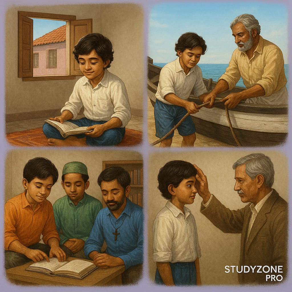 🟢 Answer: The lesson conveys that simplicity, honesty, religious harmony, education, and determination are the foundations of success and that childhood values shape a person’s destiny.