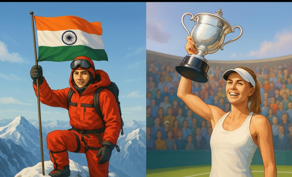 Reach for the Top narrates the inspiring journeys of Santosh Yadav and Maria Sharapova. Santosh Yadav, born in Haryana, refused to accept traditional restrictions on women. She pursued education and mountaineering, eventually climbing Mount Everest twice, becoming the first woman to do so. Her courage, determination, and humility made her a role model for women worldwide. Maria Sharapova, born in Russia, faced cultural challenges and family separation when she moved to the USA for tennis training. Through sacrifice and discipline, she overcame hardships and won Wimbledon at 17, later becoming world number one. Both Santosh and Maria show that true success is achieved not by privilege but by perseverance, self-belief, and resilience. Their lives inspire students to pursue their dreams fearlessly and with hard work.