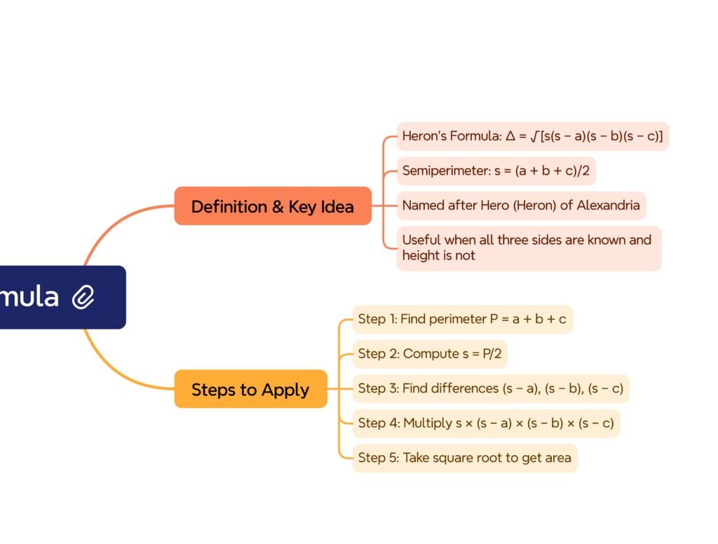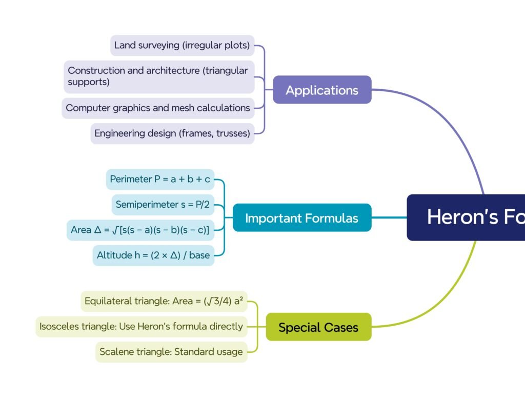 🟢 Heron’s Formula provides a method to calculate the area of a triangle when all three sides are known. Unlike standard base–height formula, it avoids computing altitudes.
