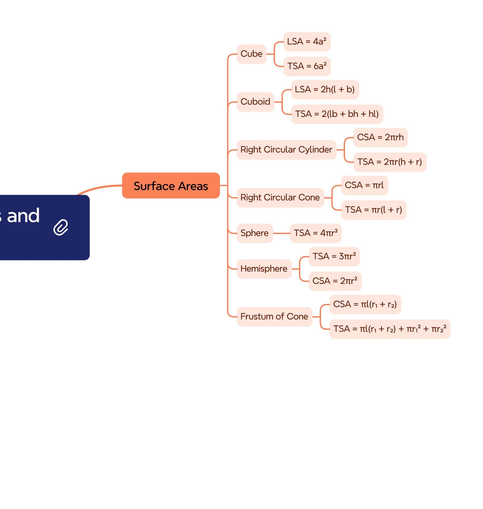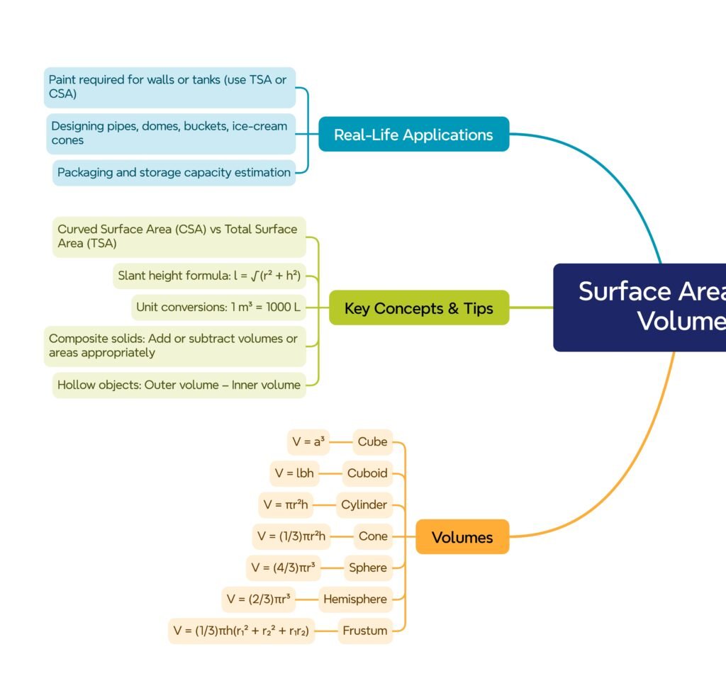 💡 Hemispheres: TSA = 3πr² (curved = 2πr² + base = πr²).