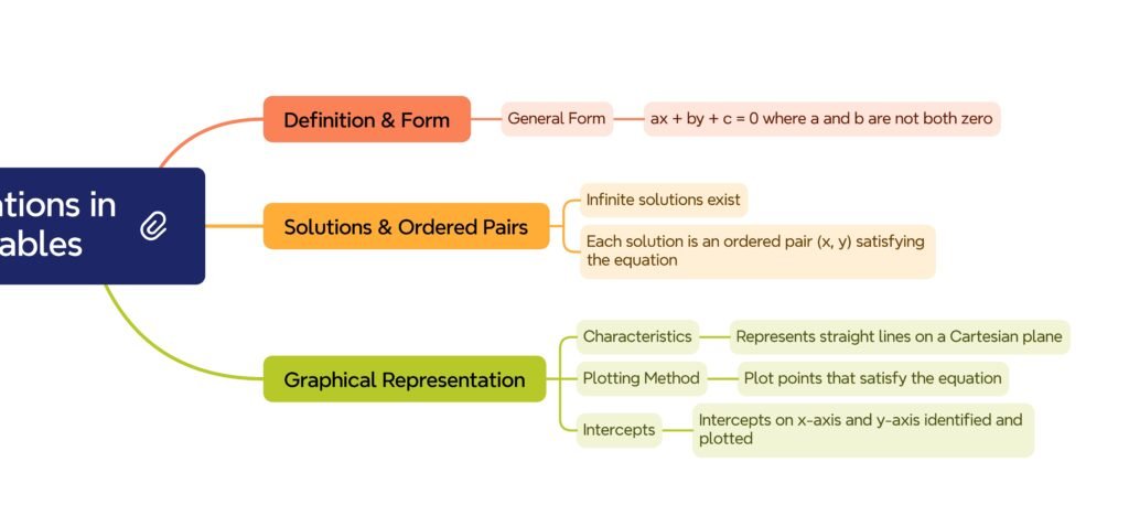 • A linear equation in two variables is an equation of the form ax + by + c = 0, where a, b, c ∈ ℝ and at least one of a, b ≠ 0.