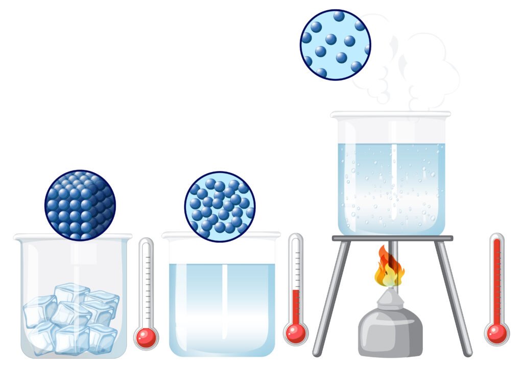 उदाहरण: बर्फ (ठोस), पानी (द्रव), भाप (गैस)।